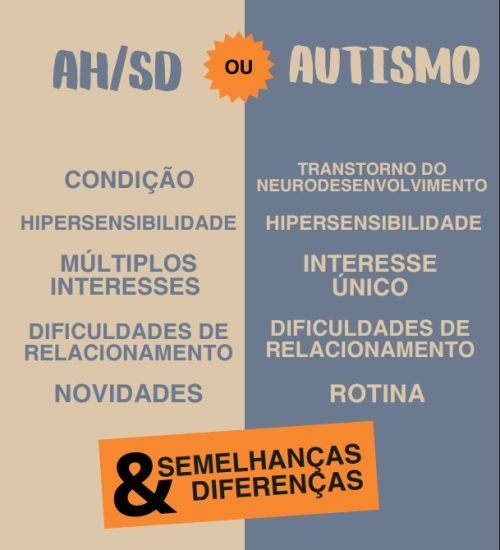 - O autismo (Transtorno do Espectro Autista – TEA), por sua vez, é um distúrbio do neurodesenvolvimento que afeta principalmente as interações sociais, a comunicação e o comportamento. Pessoas com autismo podem ter interesses restritos e comportamentos repetitivos. Muitas delas têm habilidades excepcionais em certas áreas!